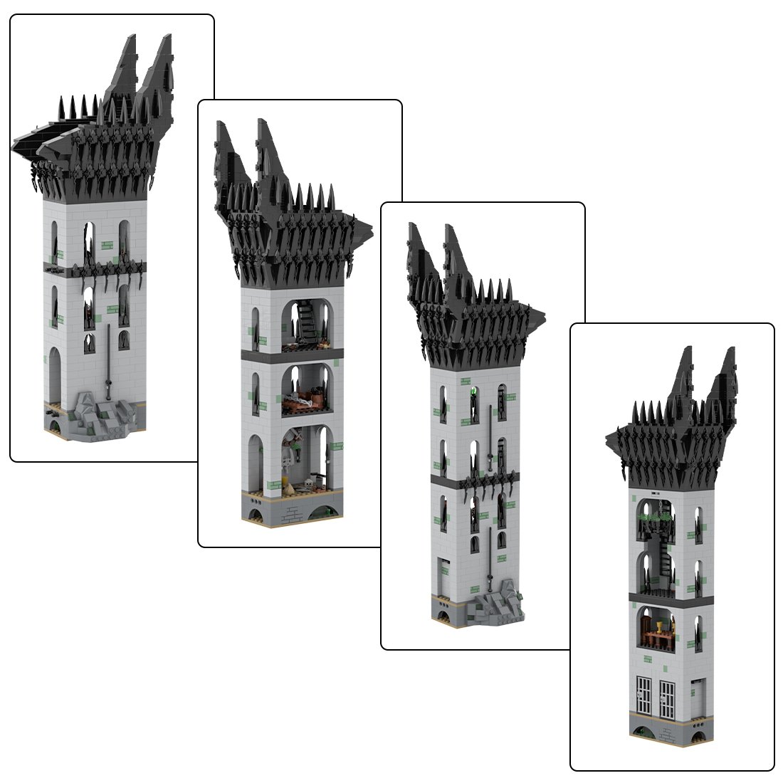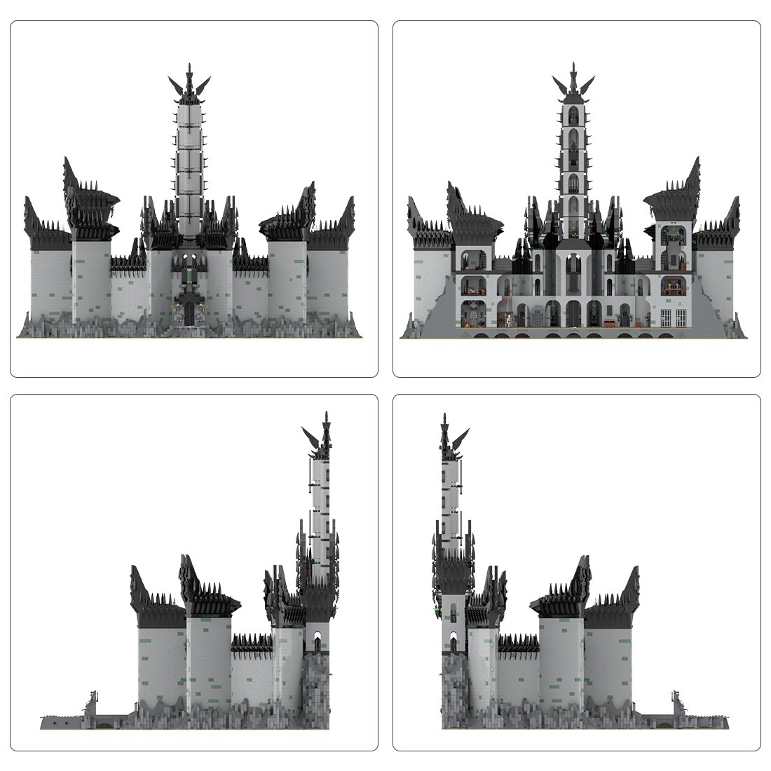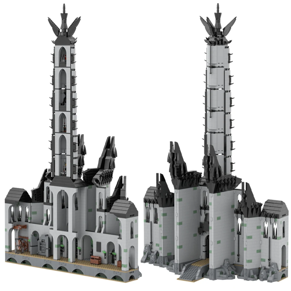 .The product is designed by Legomocloc from Rebrickable named Minas Morgul. The Ithil Tower, as the easternmost fortification in the kingdom of Gondor. This moc is divided in 4 main parts and includes: The Ithil Tower which represents the high tower of the moon and the main fortress, The orc mansion, the Morgul prison and the external main wall of the citadel with gates on the Morgul Valley. Figure accessory and printed object are not included.