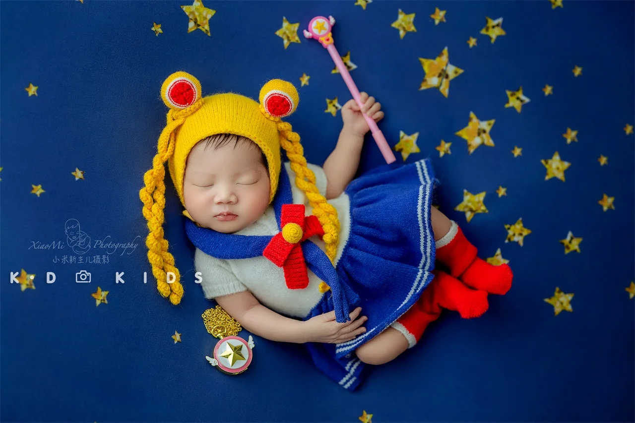 Newborn Photography Props for Girl Sailor Moon Outfit Hat Pillow Moon Star Background Blanket Set Baby Photo Bodysuit Romper