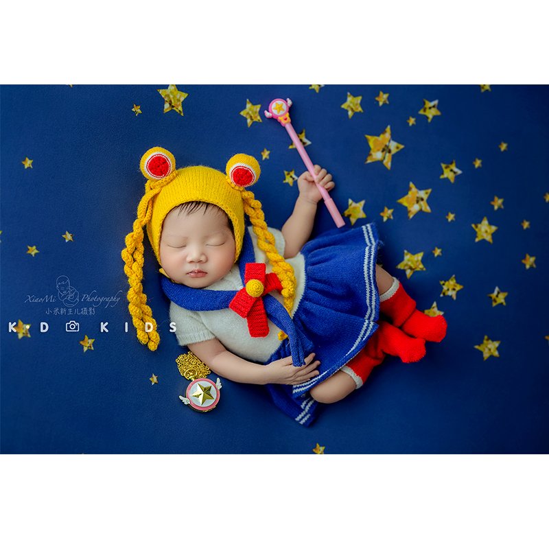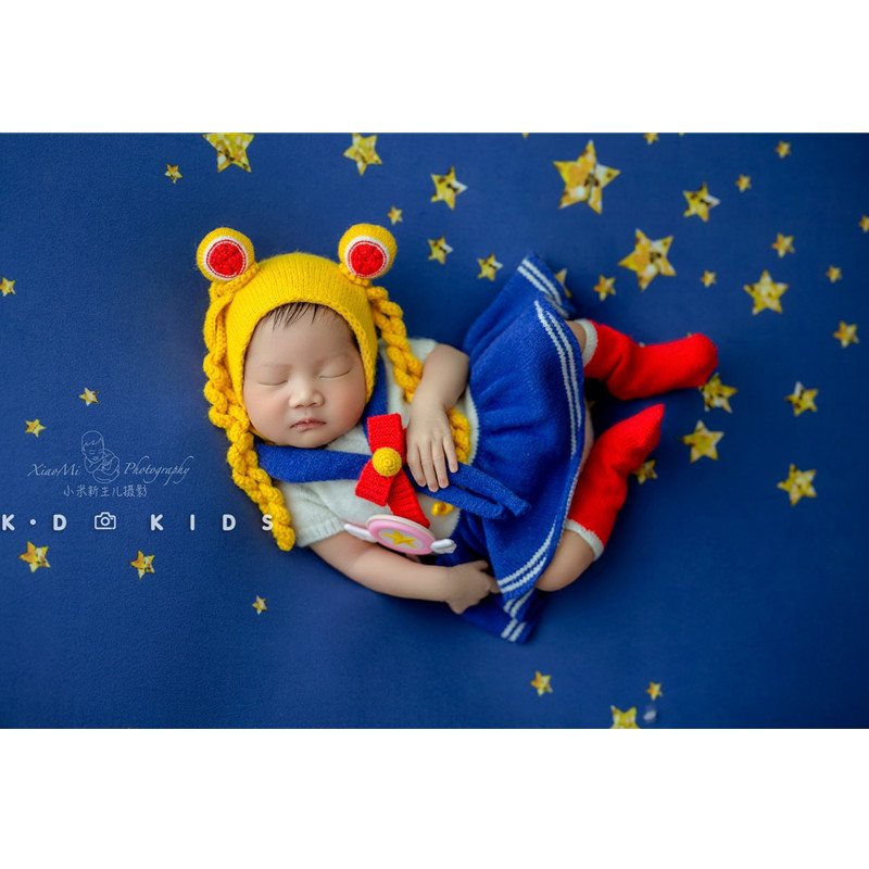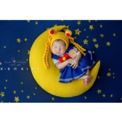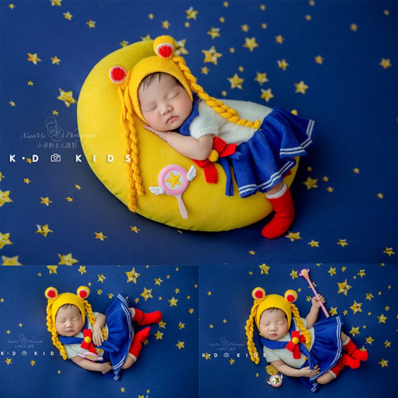 Newborn Photography Props for Girl Sailor Moon Outfit Hat Pillow Moon Star Background Blanket Set Baby Photo Bodysuit Romper