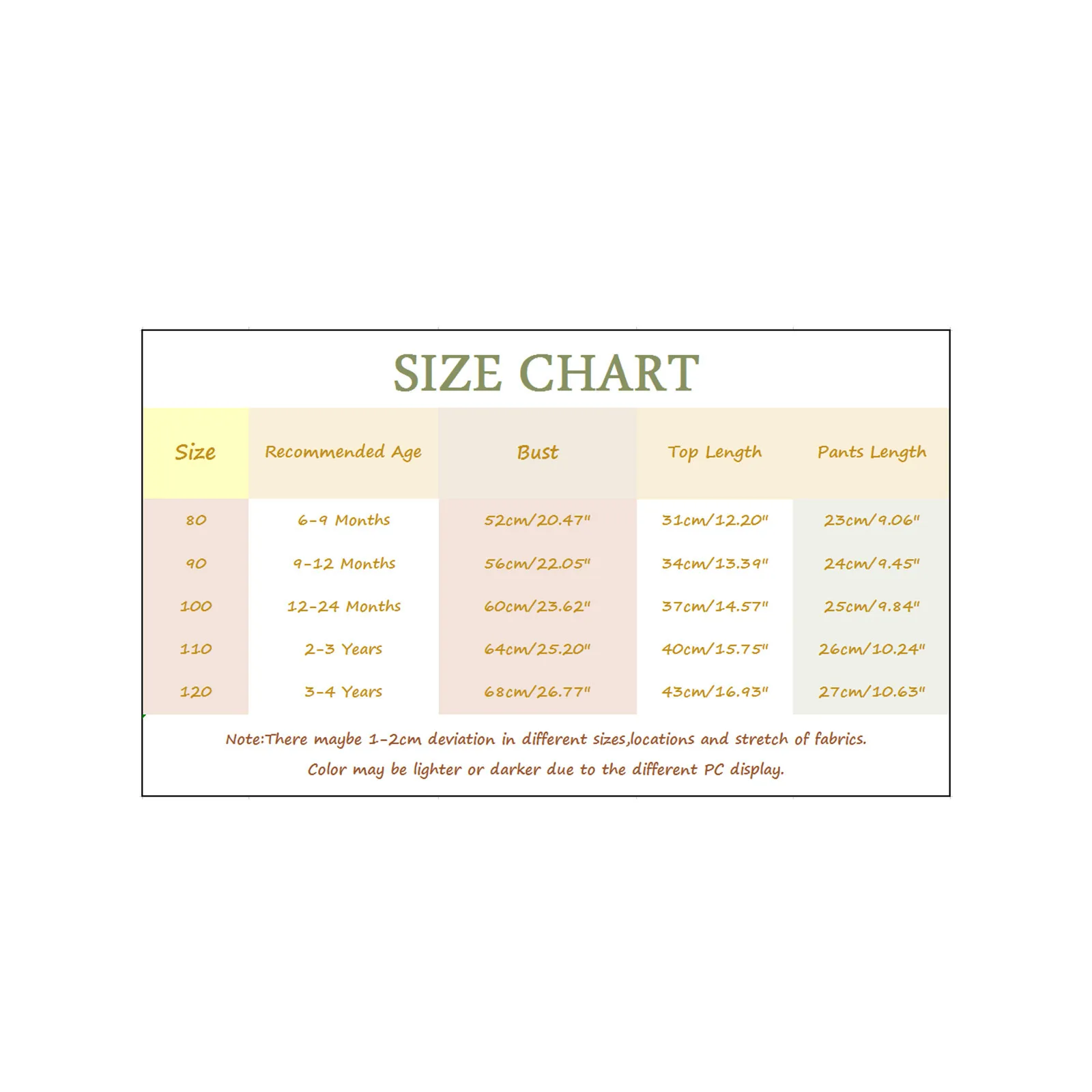 | Size:100 | Recommended Age:12-24 Months | Bust:60cm/23.62” | Top Length:37cm/14.57” | Shorts Length:25cm/9.84” |